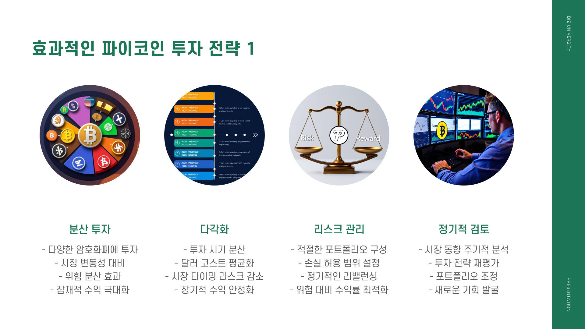 파이코인에 대한 충분한 이해를 바탕으로 다음 단계는 명확한 투자 전략을 세우는 것입니다. 성공적인 투자자는 항상 계획된 전략에 따라 행동합니다. 분산 투자는 안정성을 높이는 좋은 방법 중 하나입니다. 특정 자산에 집중하기보다는 여러 자산에 분산 투자함으로써 위험을 최소화할 수 있습니다.
