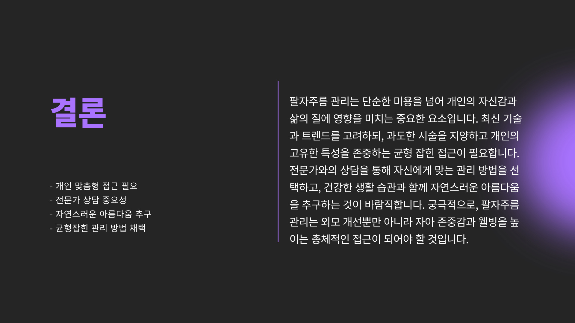 팔자주름 보톡스는 나이가 들면서 생기는 자연스러운 현상을 극복하는 효과적인 방법입니다. 이를 통해 보다 젊고 활력 있는 이미지를 유지할 수 있습니다. 그러나 항상 전문가와 상담하여 자신의 피부 상태에 맞는 적절한 시술을 결정하는 것이 중요합니다. 팔자주름 개선을 위한 첫 걸음을 내딛어 보세요!