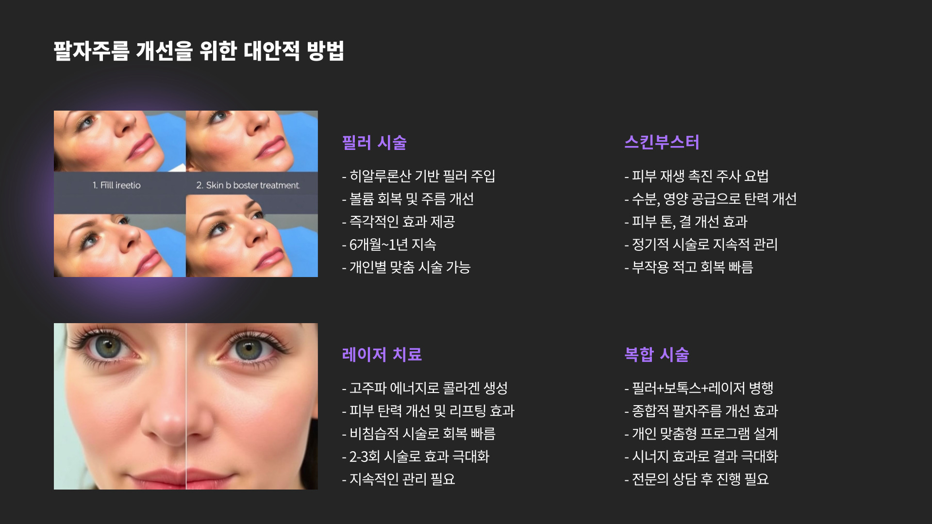 팔자주름을 개선하기 위한 다양한 방법 중에서, 보톡스와 필러는 가장 효과적인 선택 중 하나입니다. 보톡스는 주름을 형성하는 근육을 이완시켜 주름의 깊이를 줄여주는 반면, 필러는 주입된 부위에 볼륨을 더해주어 자연스러운 윤곽을 만들어 줍니다. 이 두 가지 시술을 병행하면 더 효과적인 결과를 기대할 수 있습니다.