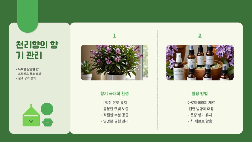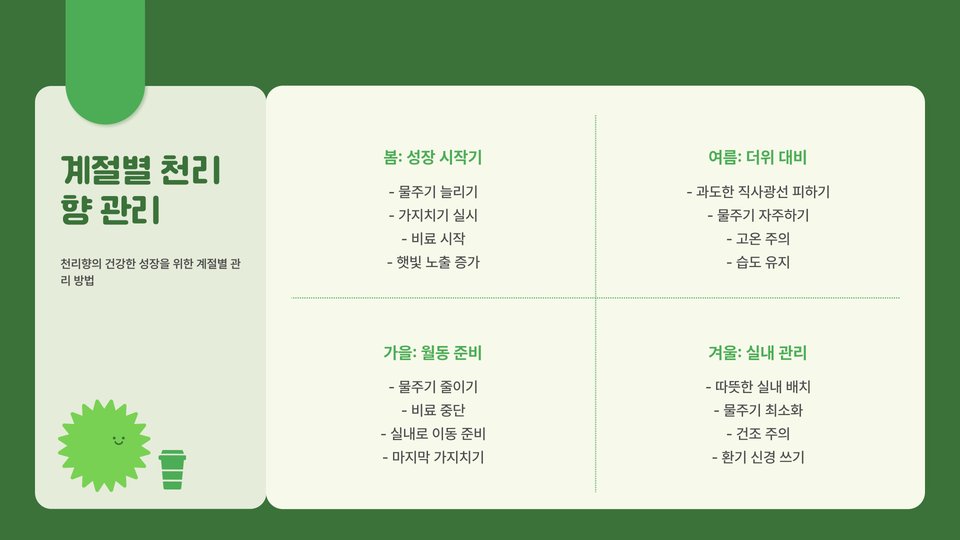첫 해에는 특별한 관리가 필요합니다. 겨울철에는 적절한 보온과 물 관리가 필요하며, 여름철에는 과습과 직사광선을 피해야 합니다. 이러한 초기의 노력이 천리향의 향기로운 열매를 보장하는 기초가 됩니다.