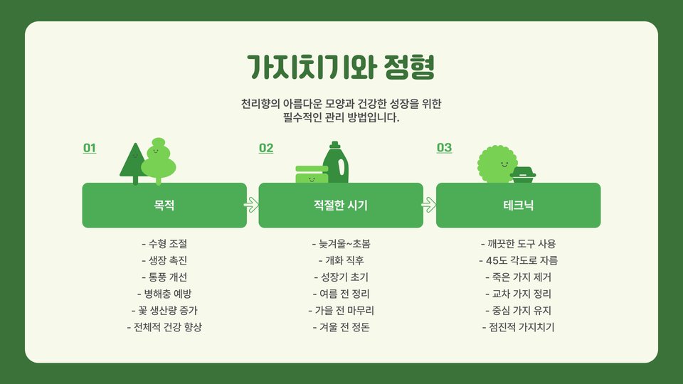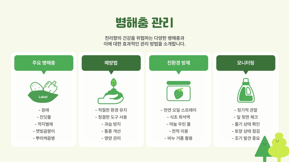 - 해충과 질병에 대한 주기적인 관리 필요.