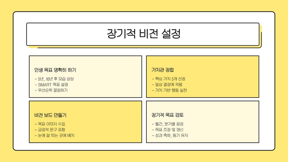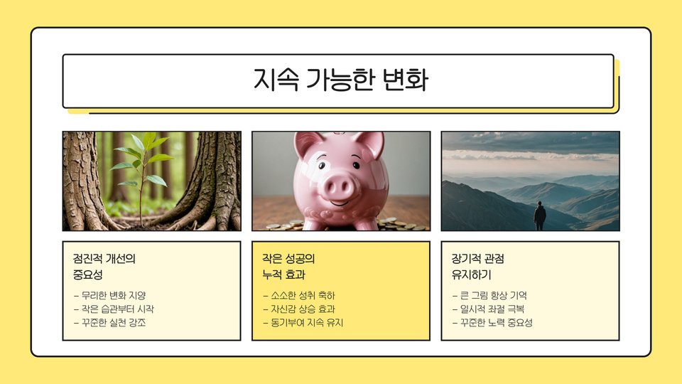 - 작은 목표 세우기와 단계별 계획이 중요합니다.