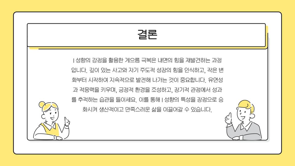 i 성향의 게으름은 여러 요인이 복합적으로 작용하는 결과입니다. 그러므로 자신의 상태를 이해하고, 위에서 언급한 방법들을 활용하여 조금씩 변화해 나가길 바랍니다. 미래의 나에게 투자하는 것이므로, 그 과정이 어렵더라도 포기하지 말고 지속적으로 노력해 나가세요!
