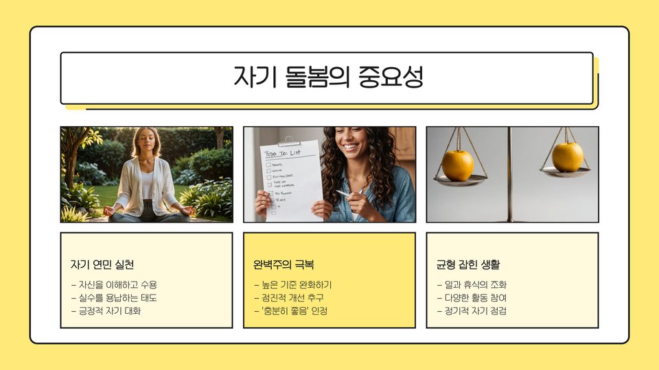 게으름을 극복하기 위해서는 상황을 객관적으로 바라보는 시각이 필요합니다. 자신이 부족하다고 느끼는 부분보다, 현재 자신이 할 수 있는 일에 집중하고 이로 인해 성취감을 느끼는 것이 중요합니다. 이를 통해 긍정적인 자아개념을 확립할 수 있습니다.