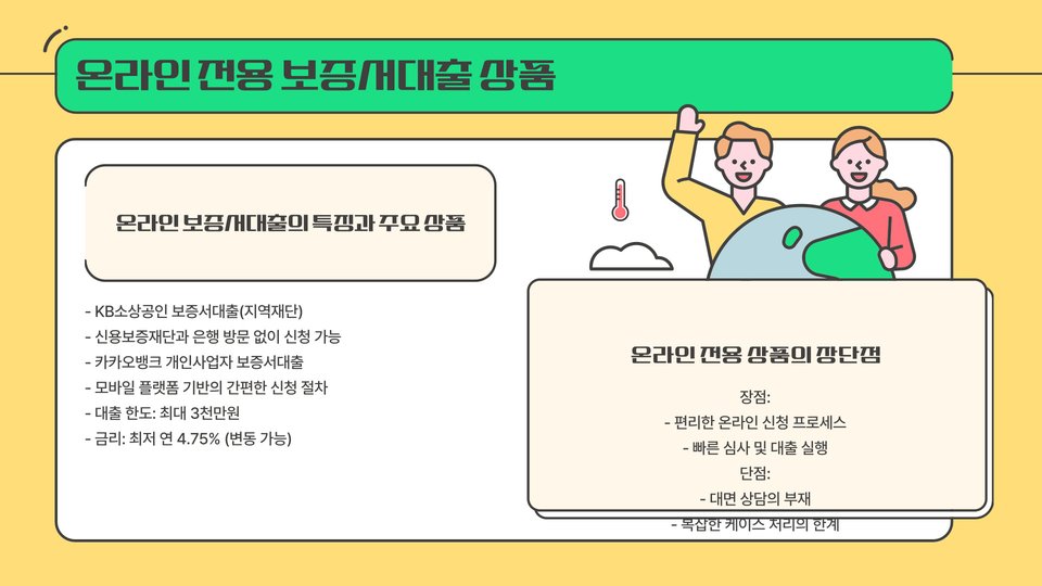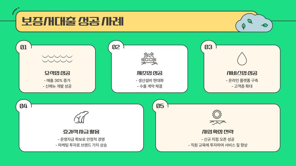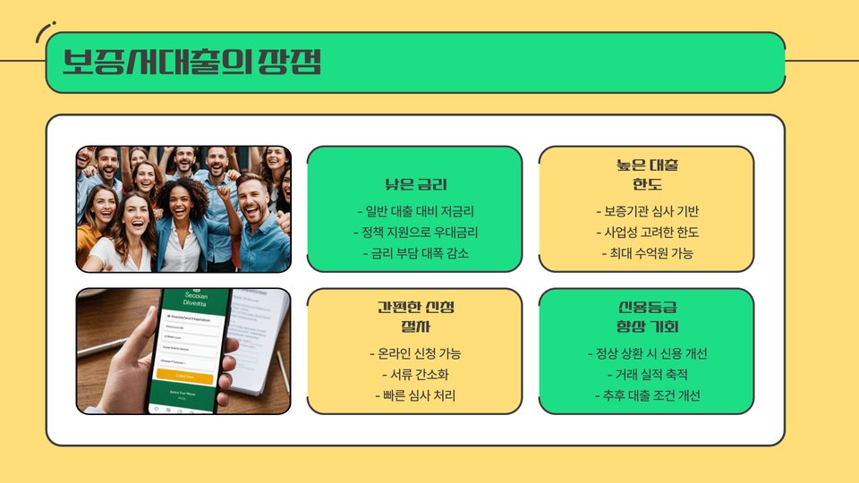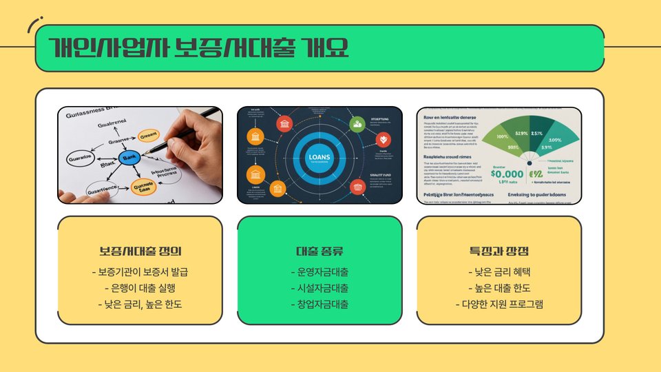 보증서대출은 사업자가 자금을 필요로 할 때, 신용보증기관이 대출에 대해 보증을 서주는 대출 방식입니다. 이 제도는 많은 개인사업자에게 실질적인 도움을 주며, 자금 조달의 문턱을 낮춰주는 역할을 합니다. 보증서를 통해 대출을 받을 수 있는 장점으로는 신용도가 낮은 사업자도 쉽게 대출을 받을 수 있다는 점이 있습니다. 신용보증재단을 통해 보증을 받으면, 연 1%대의 저렴한 이자율로 대출을 받을 수 있습니다.