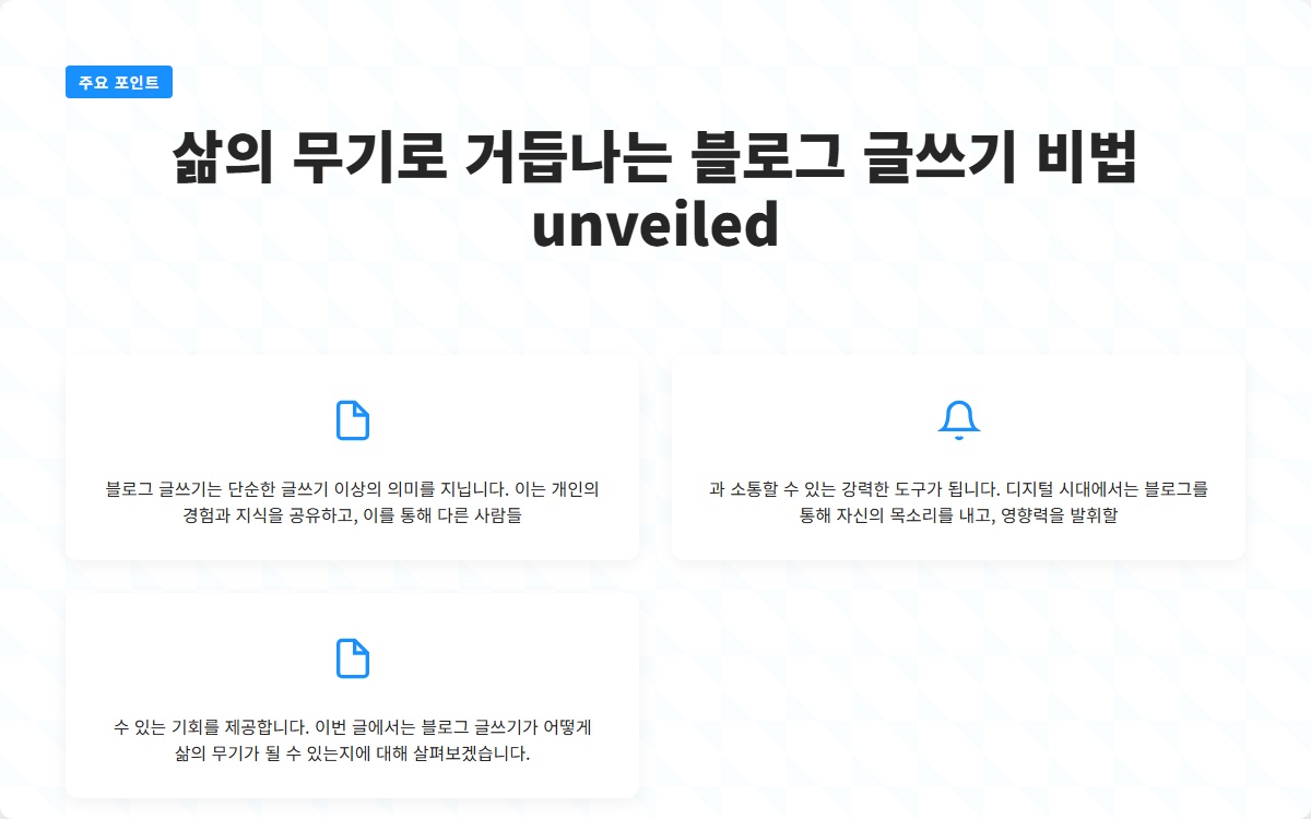블로그 글쓰기는 단순하게 정보를 전달하는 것 이상입니다. 이 과정은 개인의 성장과 변화의 도구가 됩니다. 블로그를 통해 자신을 표현하고, 다양한 사람들과의 소통을 통해 새로운 관점을 얻을 수 있습니다. 또한, 글을 쓰는 과정을 통해 자신의 생각을 정리하고 더 명료하게 표현할 수 있는 능력을 기를 수 있습니다.