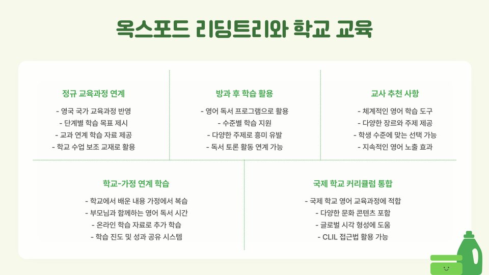 옥스포드 리딩트리는 독서를 통한 학습의 유용성을 극대화하는 프로그램입니다. 아동의 능력과 흥미를 존중하고, 그에 맞는 자료를 제공함으로써 독서에 대한 의욕을 불러일으키는 것이 중요합니다. 특히 교육적 관점에서 매우 효과적인 접근을 하고 있다는 점에서 학부모와 교사들 사이에서도 큰 찬사를 받고 있습니다.