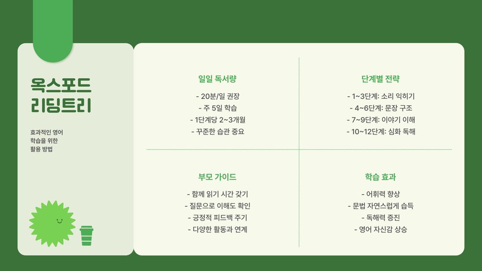 옥스포드 리딩트리를 최대한 활용하기 위해서는 몇 가지 팁을 고려하는 것이 좋습니다. 매일 조금씩 읽기는 매우 중요합니다. 매일 일정 시간을 정해 놓고 독서하는 습관을 기르면, 어린이들은 자연스럽게 독서에 익숙해질 수 있습니다. 또한, 가족과 함께 읽기를 통해 독서의 재미를 느끼게 할 수 있습니다. 가족이 함께 독서를 하며 책에 대한 이야기를 나누는 것은 어린이에게 큰 동기부여가 될 수 있습니다. 마지막으로, 독서 일지 작성을 통해 읽은 책에 대한 생각이나 느낀 점을 기록하는 것도 좋은 방법입니다. 이를 통해 어린이들은 자신의 생각을 정리하고 표현하는 능력을 키울 수 있습니다.