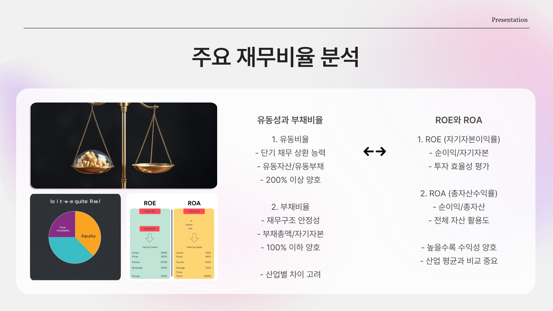 재무제표를 해석할 때는 각 항목의 숫자만 보는 것이 아니라, 비율 분석을 통해 더 깊이 있는 정보를 얻는 것이 중요합니다. 예를 들어, 유동비율(Current Ratio)은 유동자산을 유동부채로 나눈 값으로, 기업의 단기 지급 능력을 나타냅니다. 일반적으로 1 이상이면 안정적입니다.