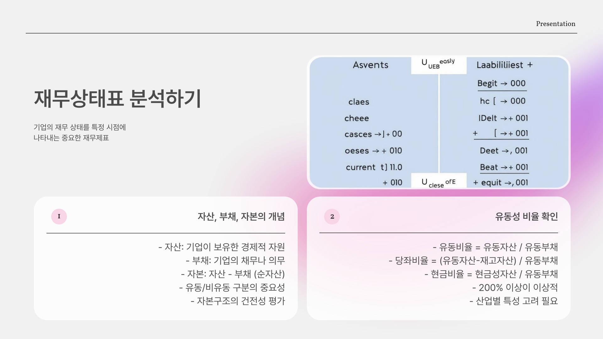 재무제표를 단순히 숫자로만 보면 복잡하게 느껴질 수 있지만, 주목해야 할 몇 가지 핵심 지표가 있습니다. 예를 들어, 유동비율과 부채비율은 회사의 유동성 및 재무 건강 상태를 나타내죠.