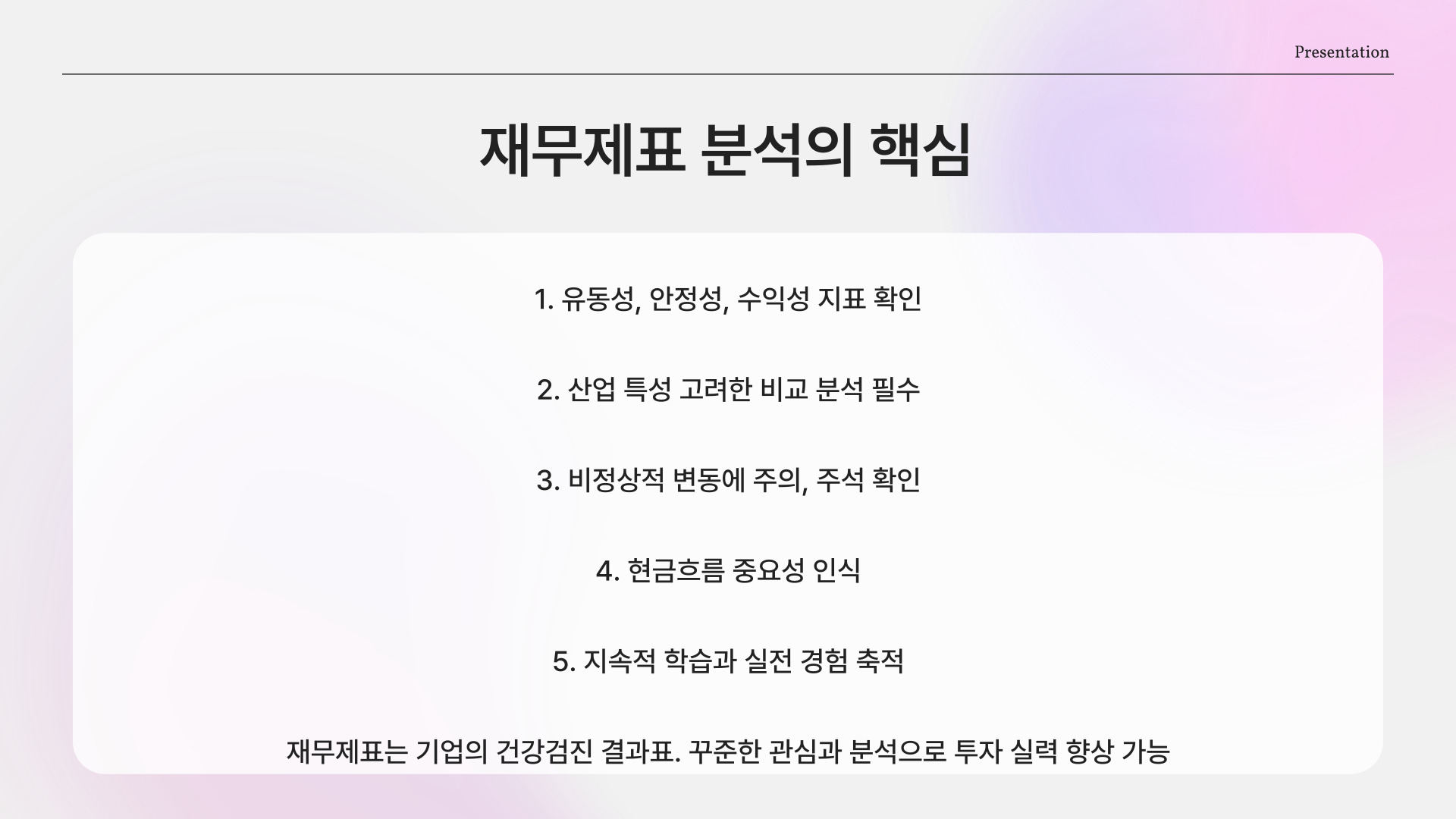 재무제표를 이해하는 것은 기업을 분석하는 데 있어서 매우 중요한 과정입니다. 위에서 언급한 꿀팁을 바탕으로 재무제표를 효과적으로 해석할 수 있습니다. 기본 구성 요소, 해석 방법, 경고 사항을 잘 숙지하면, 더 나은 투자 결정을 내릴 수 있을 것입니다.