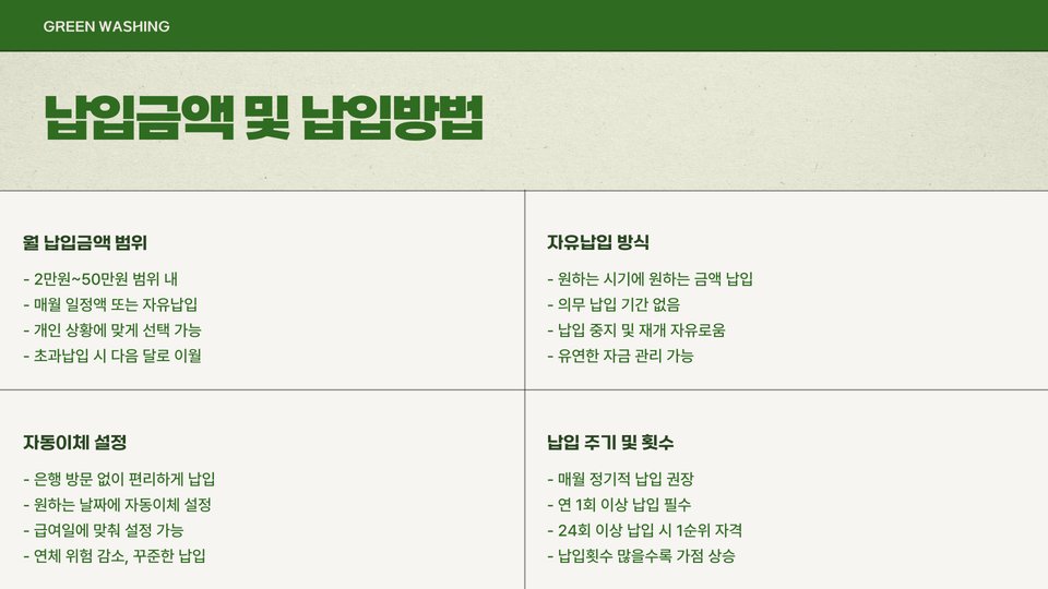 - 세제 혜택: 일정 조건을 만족하면 세금 면제 또는 세액 공제를 받는 혜택이 있습니다.