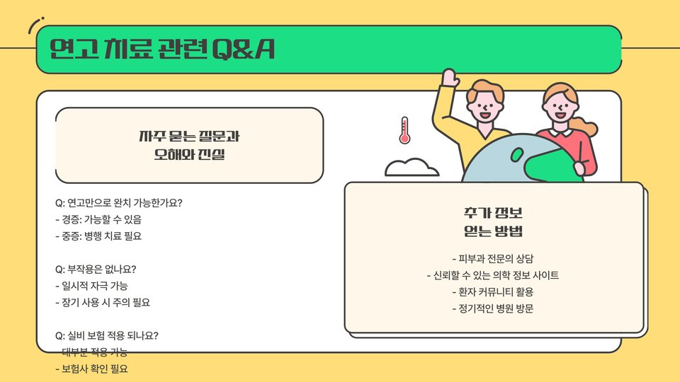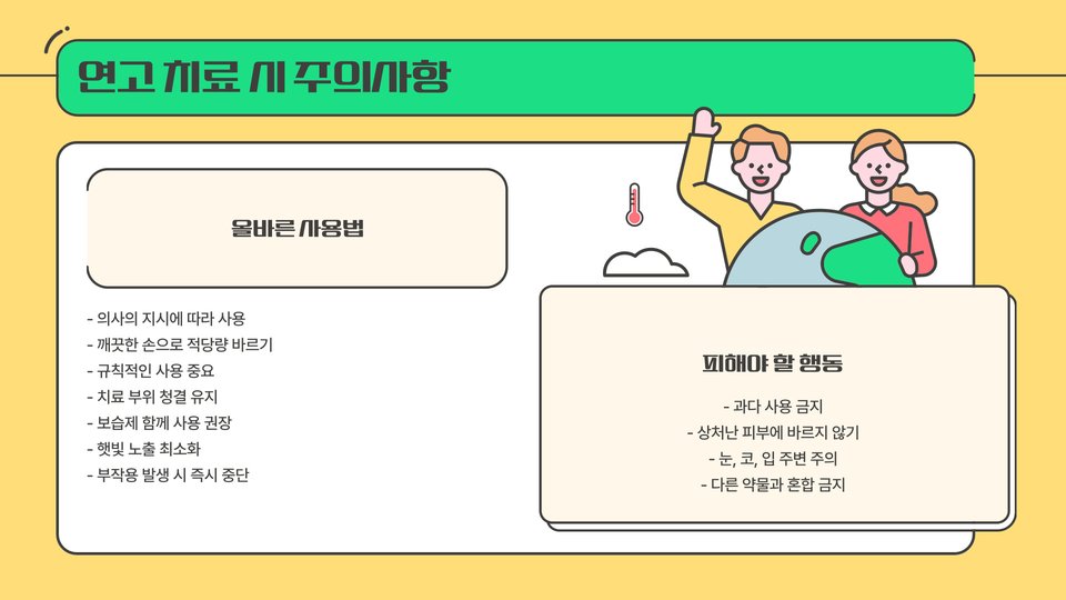 연고 사용 시 몇 가지 주의사항이 있습니다. 우선, 피부 자극이 발생할 수 있으므로, 처음 사용하는 경우 소량으로 테스트하는 것이 좋습니다. 또한, 사용 후에는 반드시 손을 씻어야 하며, 다른 부위에 접촉하지 않도록 주의해야 합니다. 마지막으로, 사마귀의 크기가 커지거나 통증이 발생할 경우 즉시 의료 전문가와 상담하는 것이 필요합니다.