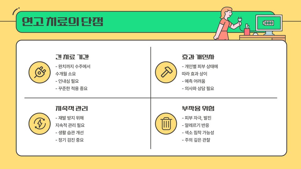 각 연고는 고유한 장점과 단점을 가지고 있습니다. 살리실산 연고의 경우, 사용이 간편하고 비용이 저렴하다는 장점이 있습니다. 하지만, 효과를 보기까지 시간이 오래 걸릴 수 있다는 단점이 있습니다. 반면, 레티노이드 연고는 빠른 효과를 볼 수 있지만, 피부 자극이 발생할 수 있어 주의가 필요합니다.