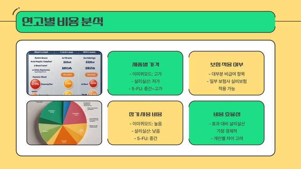 연고의 선택은 비용 대비 효과를 고려해야 합니다. 살리실산 연고는 가격이 저렴하지만 사용기간이 길어질 수 있어 총비용이 증가할 수 있습니다. 반면, 면역요법 연고는 가격이 비쌀 수 있지만, 효과가 빠른 만큼 시간과 노력을 절약할 수 있습니다. 따라서, 개인의 상황에 맞는 선택이 중요합니다.